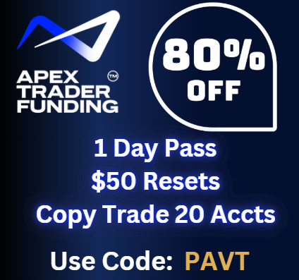Yes. You can use code PAVT to get the best discount available on MyFundedFutures, Tradeify, TakeProfitTrader, Apex, TradeDay, Lucid, FundedNext and TradeSyncer trade copier.